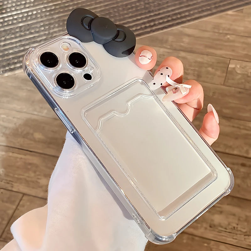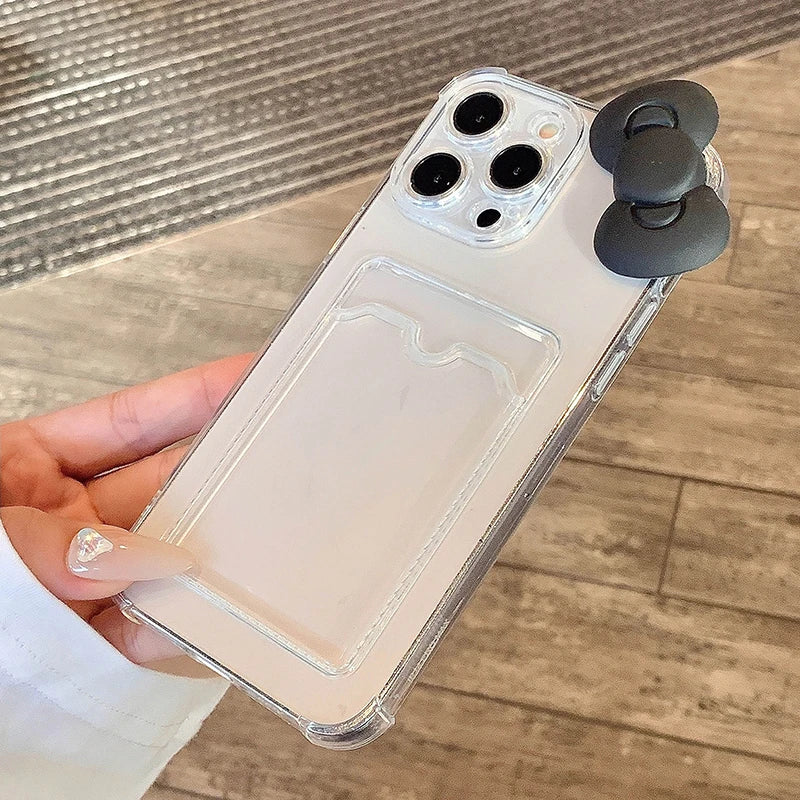 High Quality Silicone Phone Case, 3D Black Bow, Clear Phone Case with Wallet Card Pocket